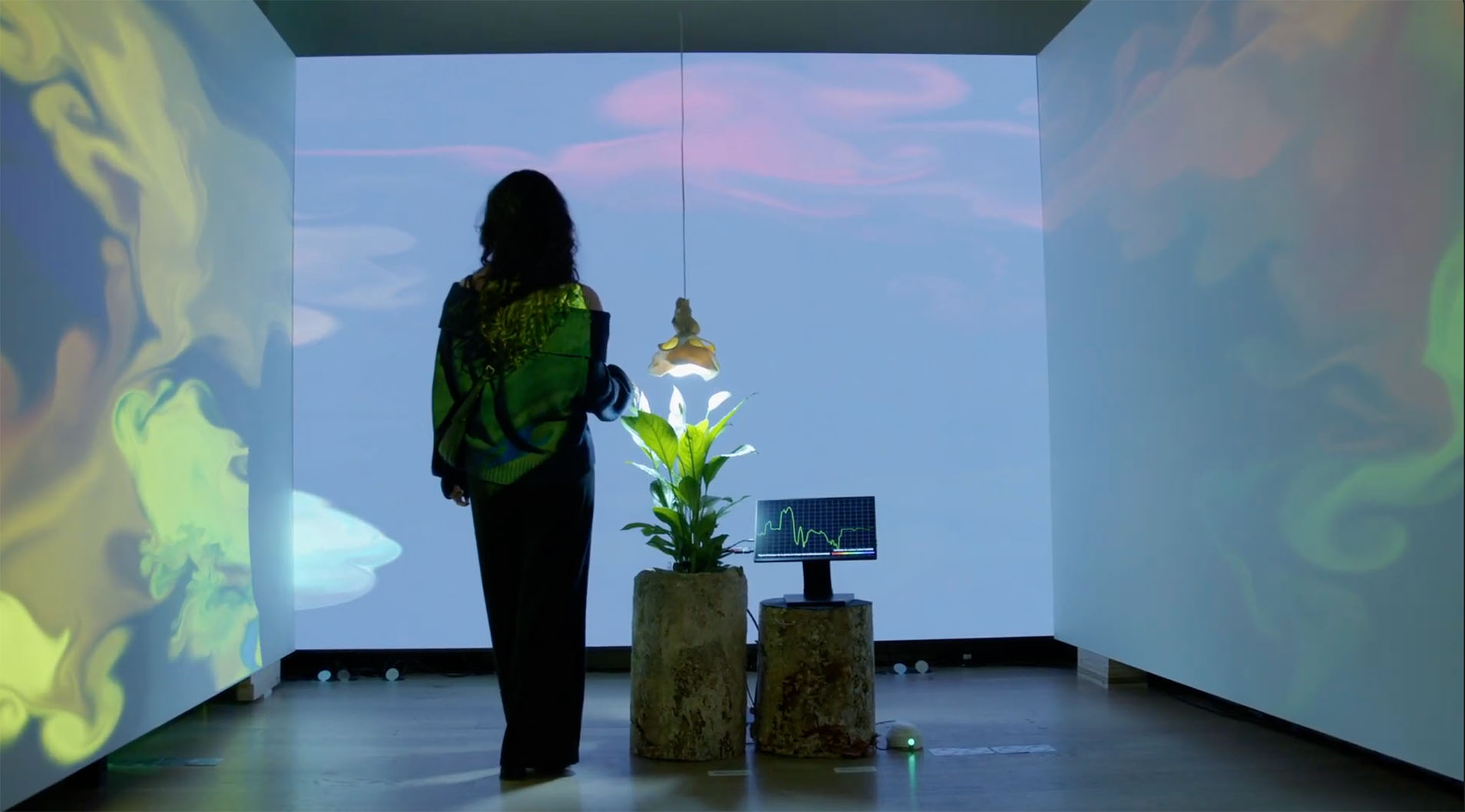 Plant Being is an audiovisual installation generated by a plant. The plant's bio-electrical impulses are captured and translated into music and video in real time.